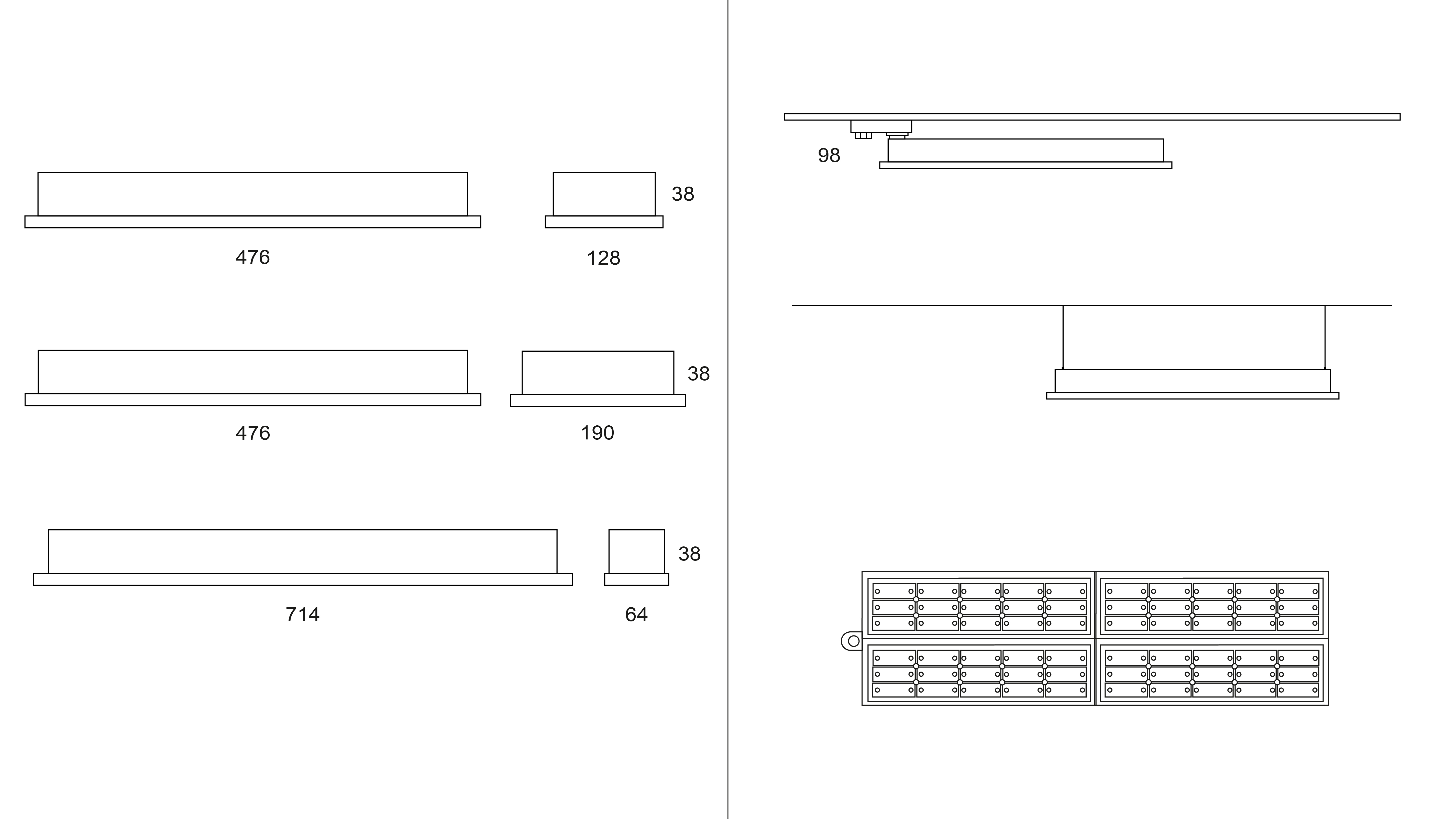Размеры: 476х190х38 / 476х190х98 / 476х128х38 / 476х128х98 / 714х64х38 / 714х64х98