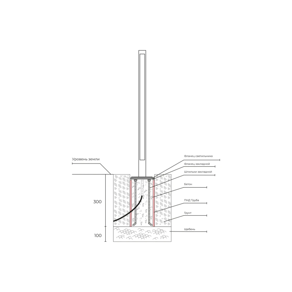 PLAY — светильник с утонченным дизайном, стильно дополняет идеи в экстерьере. Идеально вписывается в ландшафт благодаря своему современному дизайну корпуса и мягкому светораспределению. Корпус выполнен из алюминия и покрашен порошковой краской по таблице цветов RAL. Возможно изготовление нестандартных размеров. Шпильки закладной устанавливаются в ПНД трубу цилиндрической формы и соответствующей глубины с соблюдением необходимой ориентации монтажных отверстий. Для фиксации закладной она заливается бетонным раствором. При подземной проводке кабеля питания кабель в гофро-трубе или в гладкой трубе ПНД предвадительно заводится в лючок закладной детали и через фланец выводится на длину до соединительной коробки.