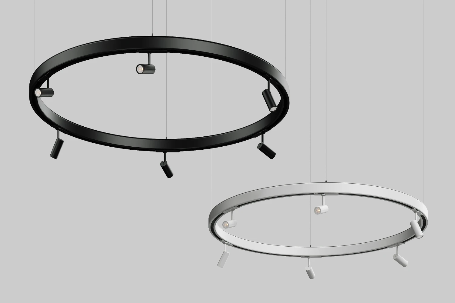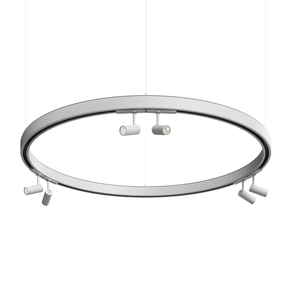 Подвесной крупногабаритный светильник кольцевой формы с интегрированными акцентными светильниками предназначен для освещения торговых помещений и оформления декоративных зон. Кольцевая основа выполняет функциональную роль, обеспечивая равномерное распределение света, в то время как акцентные элементы направляют свет на определённые объекты, создавая фокусированные акценты. Этот светильник идеально подходит для коммерческих интерьеров, сочетая высокую функциональность и современный стиль.
