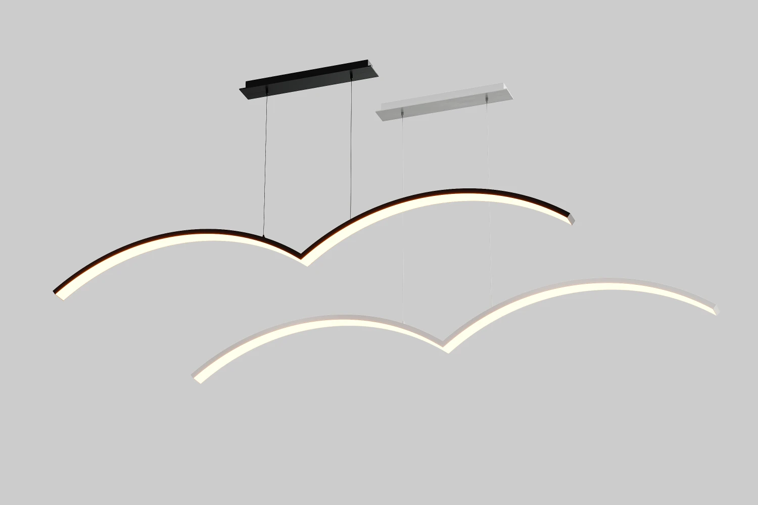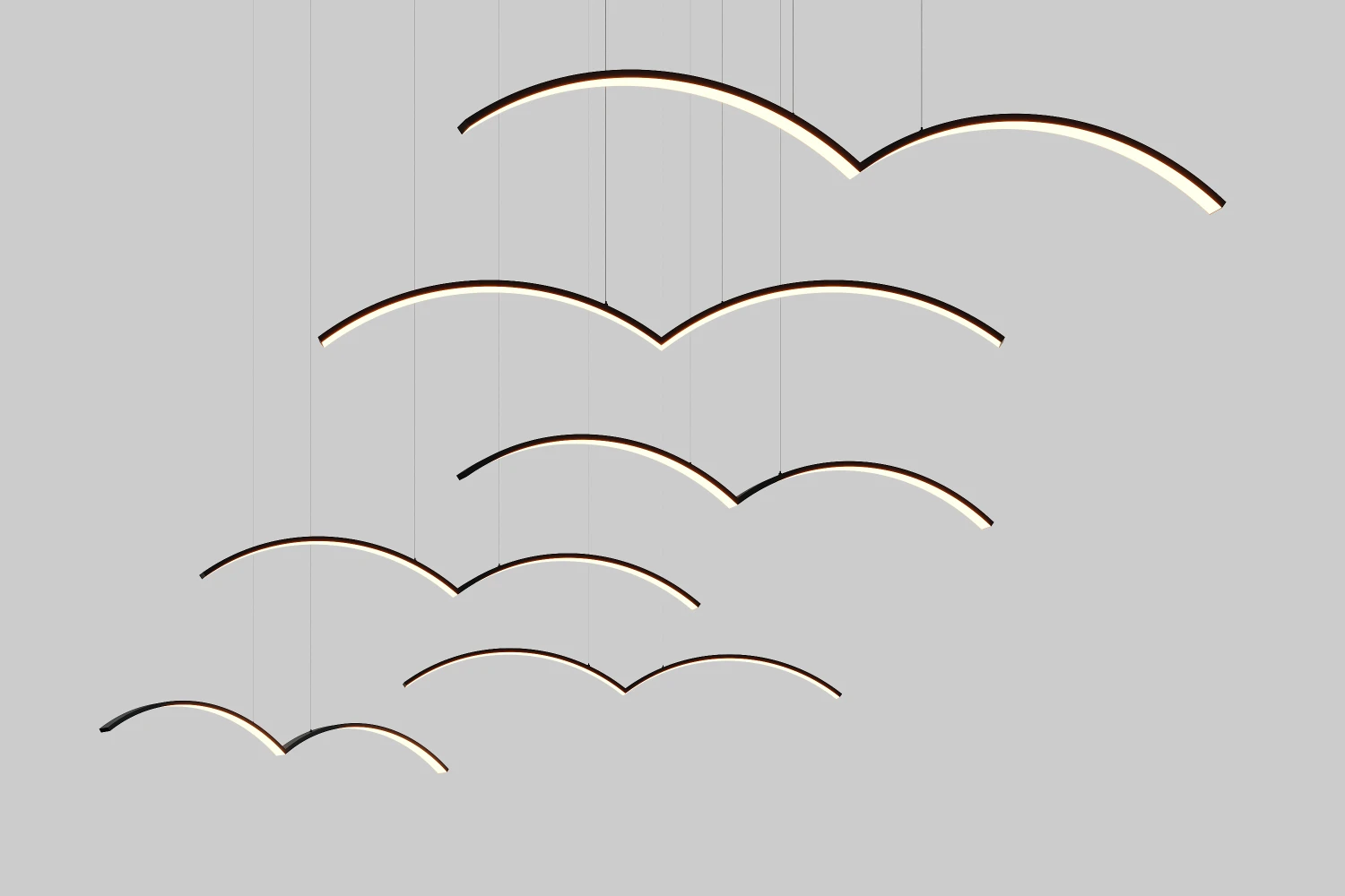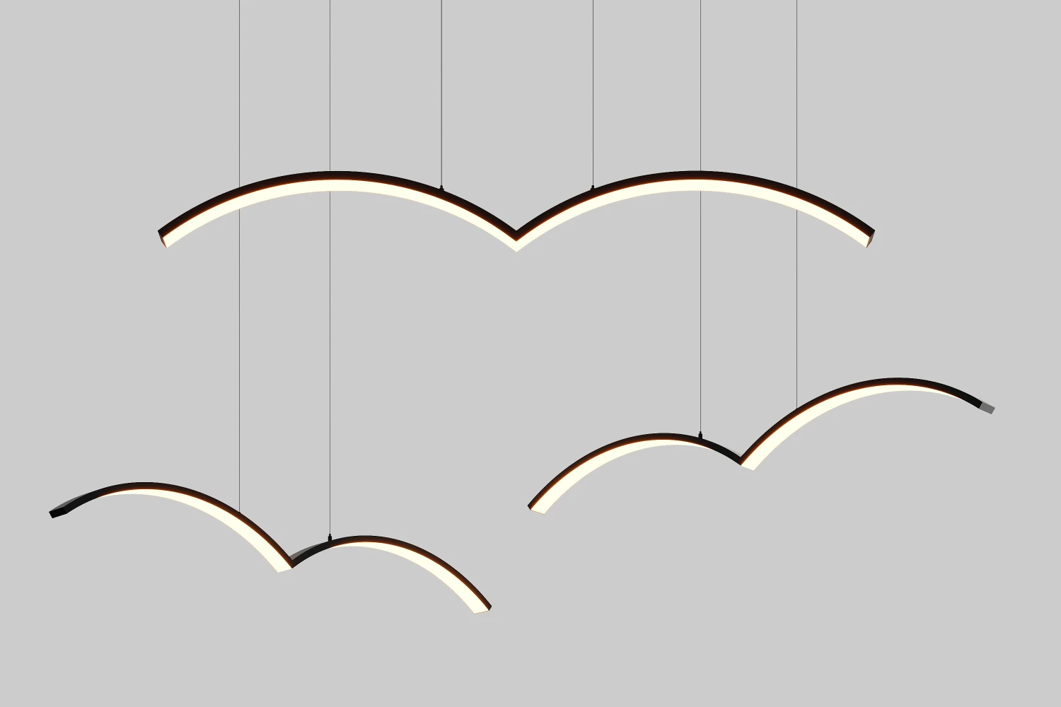 Нестандартный подвесной линейный светильник с изогнутыми линиями, напоминающими силуэт птицы, предназначен для освещения торговых залов, декоративных зон, офисных и лофт-помещений. Его оригинальная форма добавляет динамичность в интерьер, создавая уникальный визуальный акцент, при этом обеспечивая равномерное освещение.