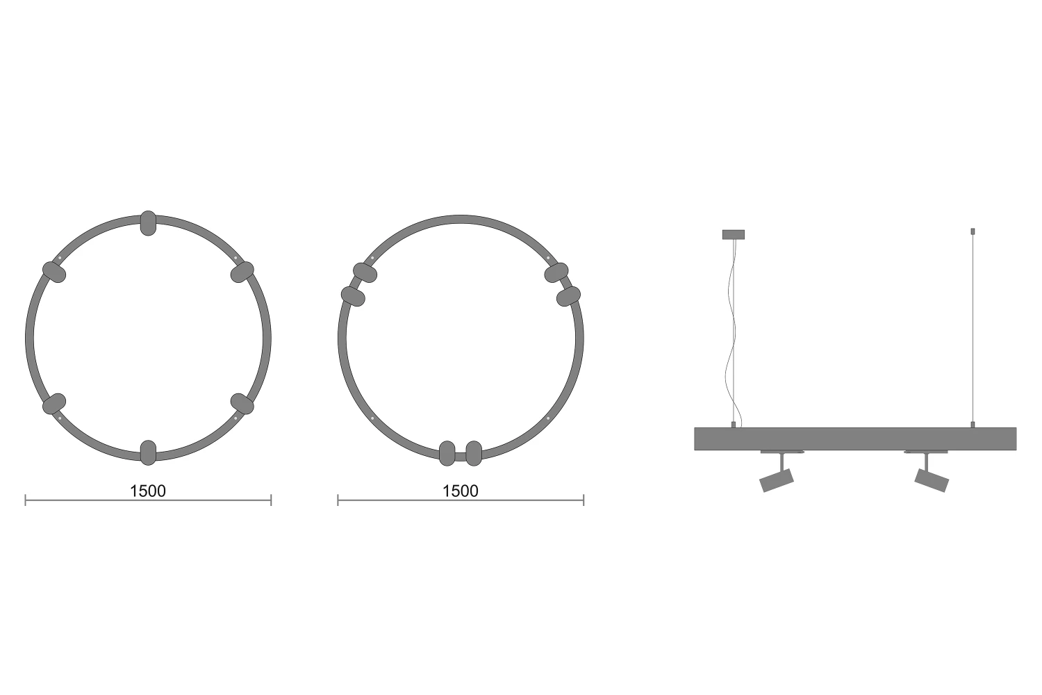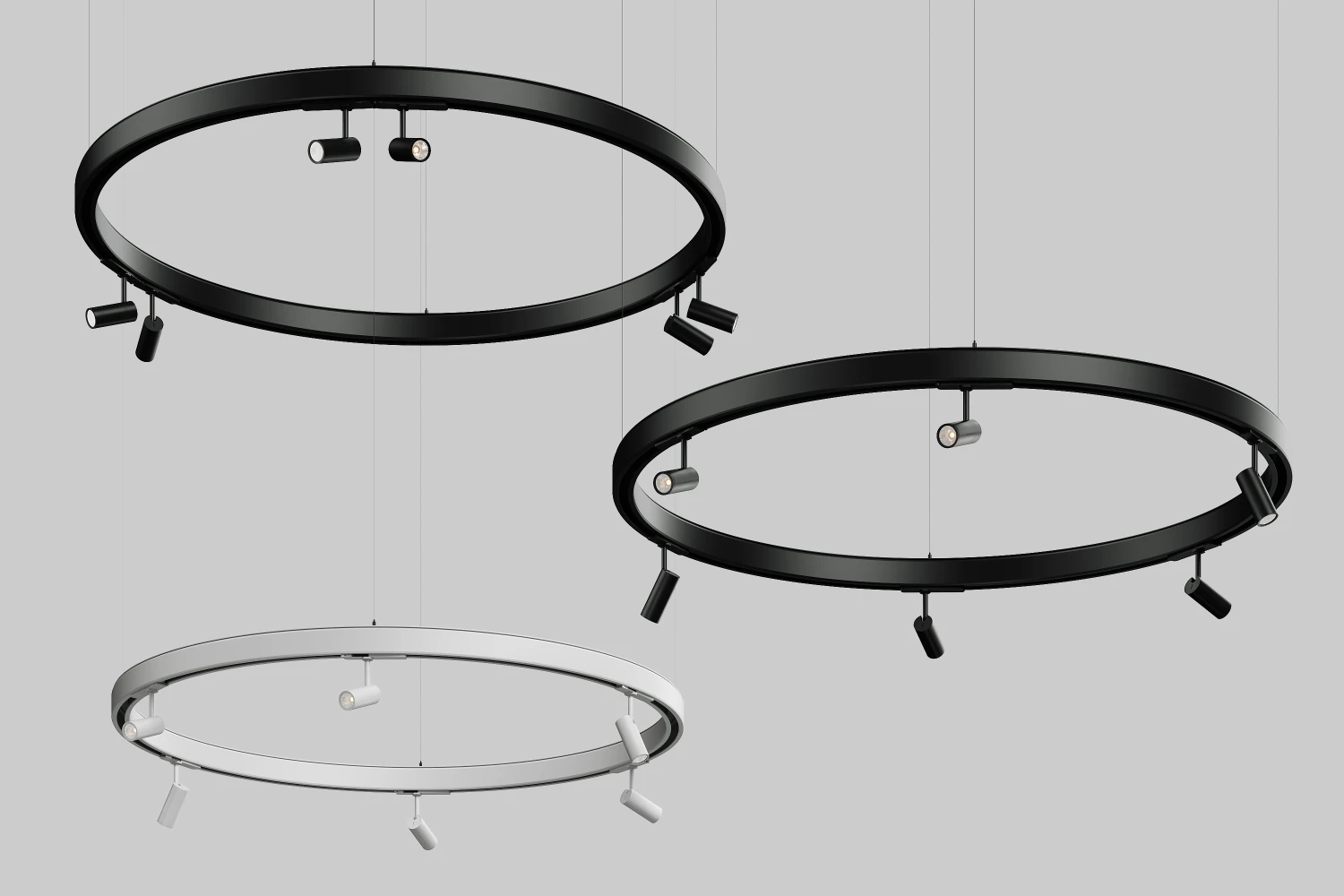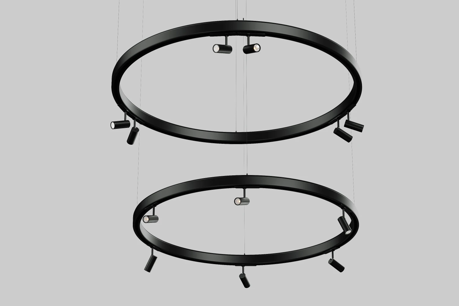 Подвесной крупногабаритный светильник кольцевой формы с интегрированными акцентными светильниками предназначен для освещения торговых помещений и оформления декоративных зон. Кольцевая основа выполняет функциональную роль, обеспечивая равномерное распределение света, в то время как акцентные элементы направляют свет на определённые объекты, создавая фокусированные акценты. Этот светильник идеально подходит для коммерческих интерьеров, сочетая высокую функциональность и современный стиль.