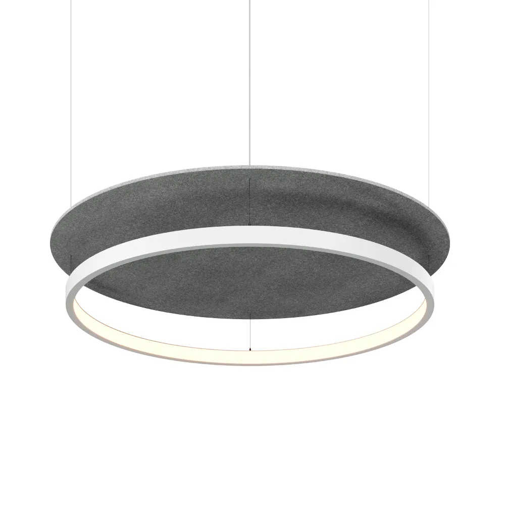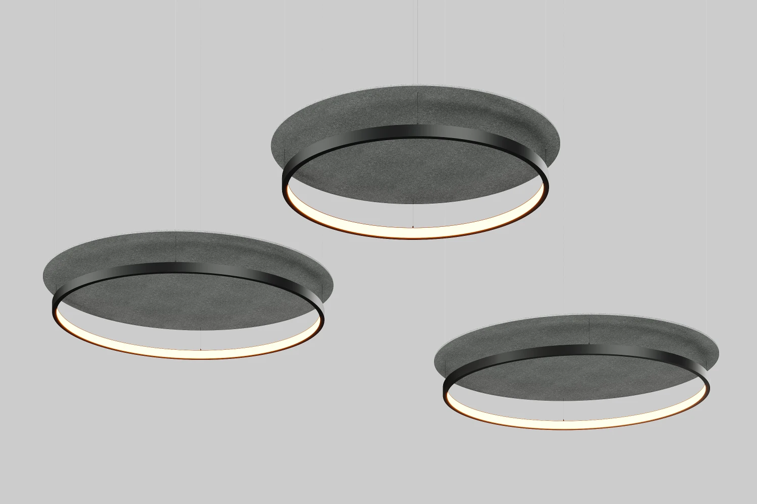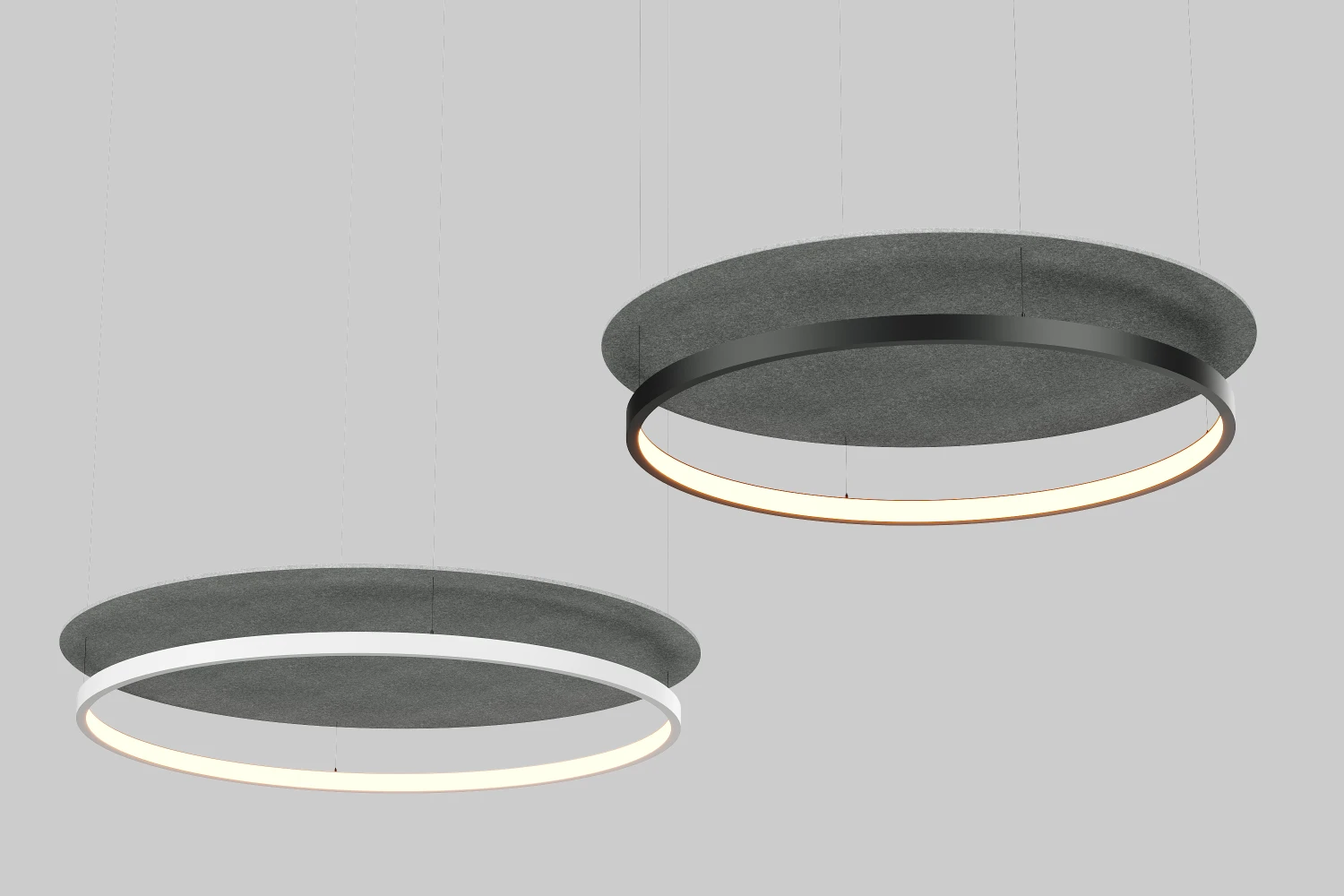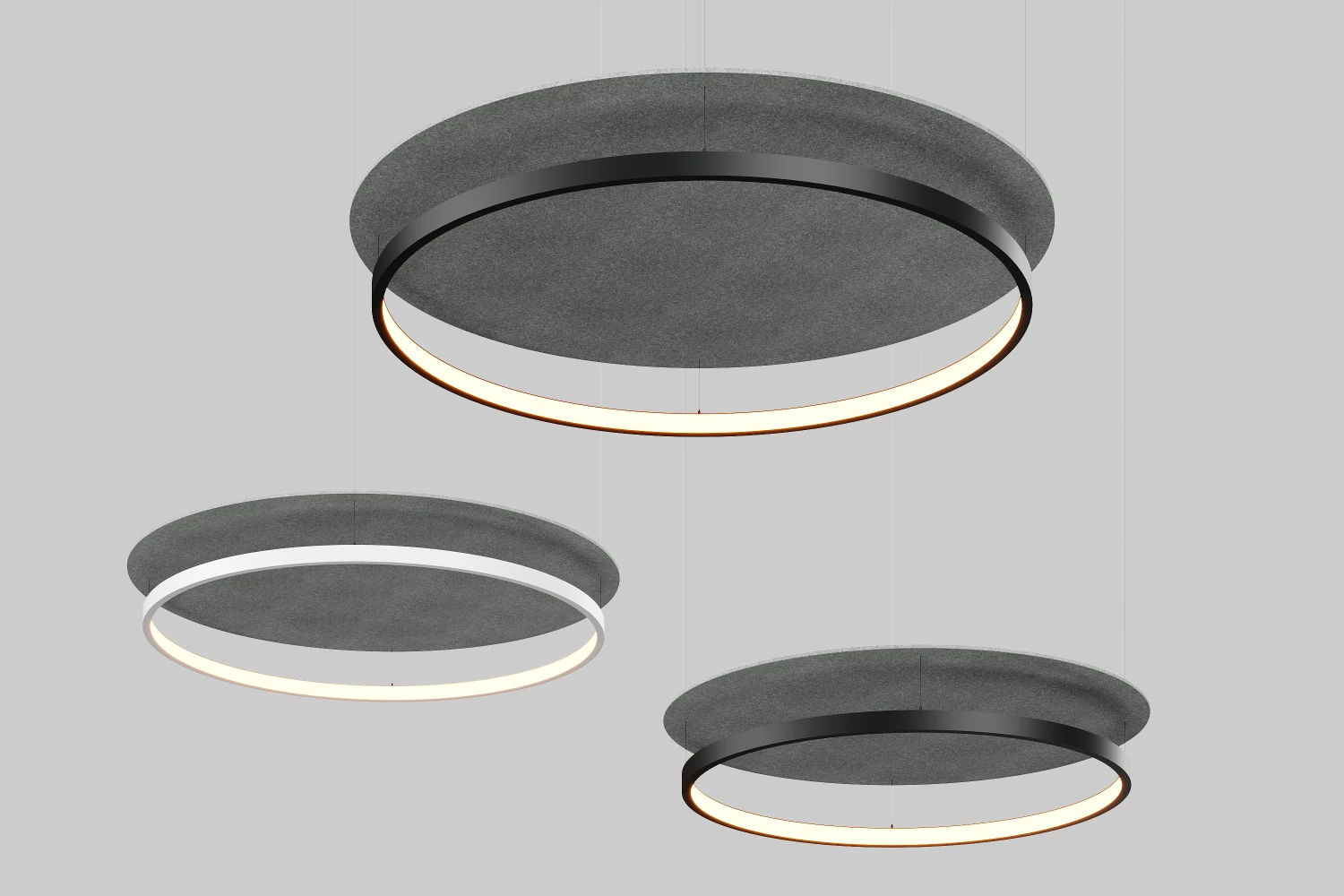 Подвесной акустический светильник кольцевой формы с минималистичным дизайном сочетает в себе функции освещения и звукоизоляции, что делает его идеальным решением для торговых, офисных и лофт помещений. Его форма не только обеспечивает равномерное распределение света, но и способствует улучшению акустических характеристик пространства. Светильник легко интегрируется в различные интерьеры, добавляя современный акцент и функциональность.