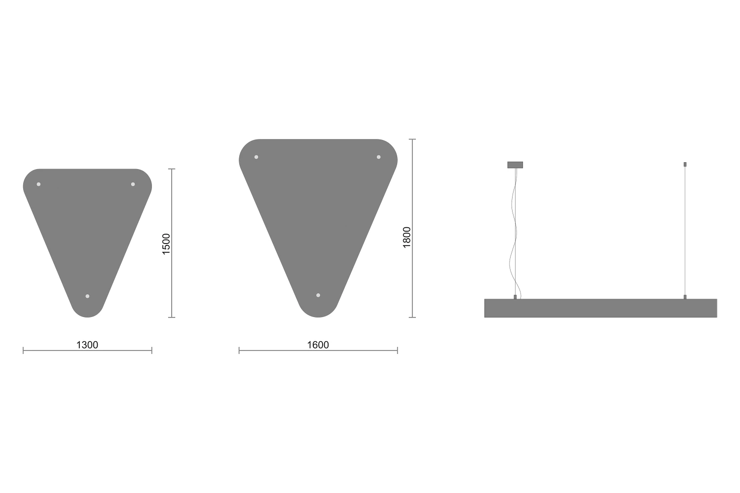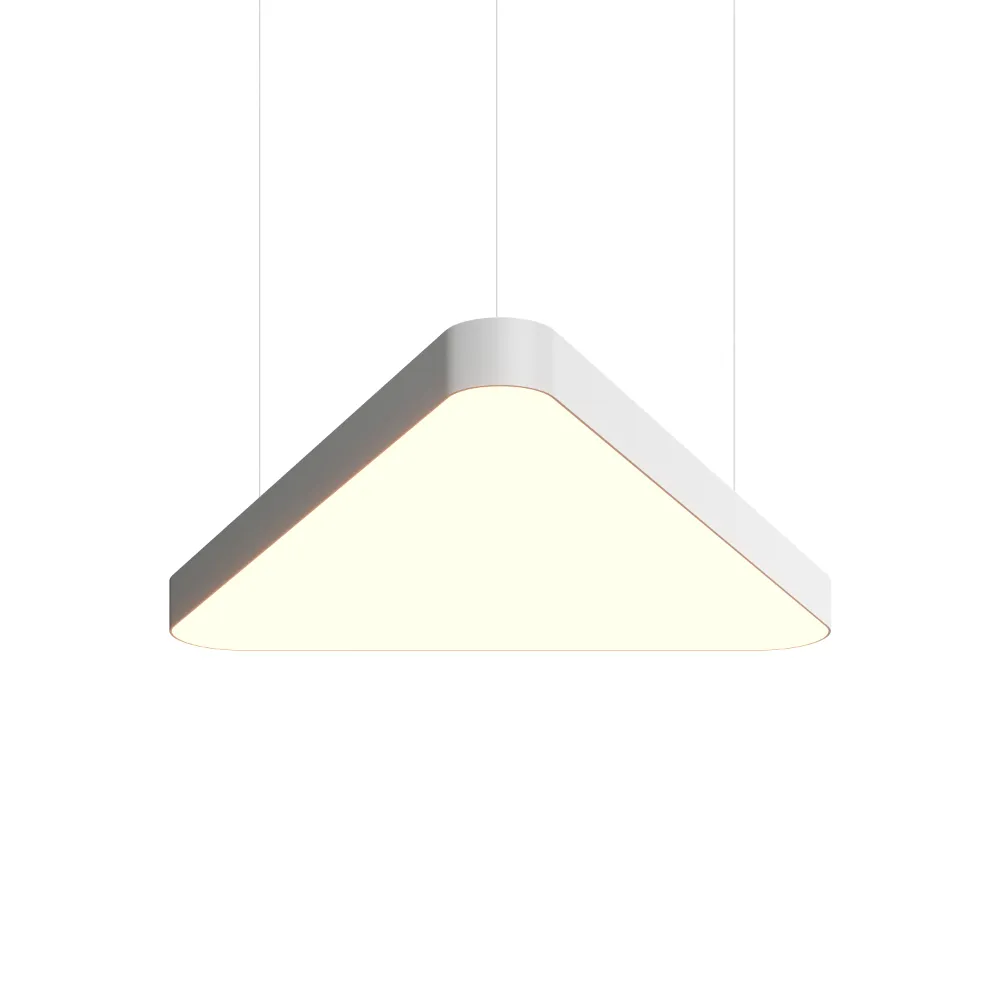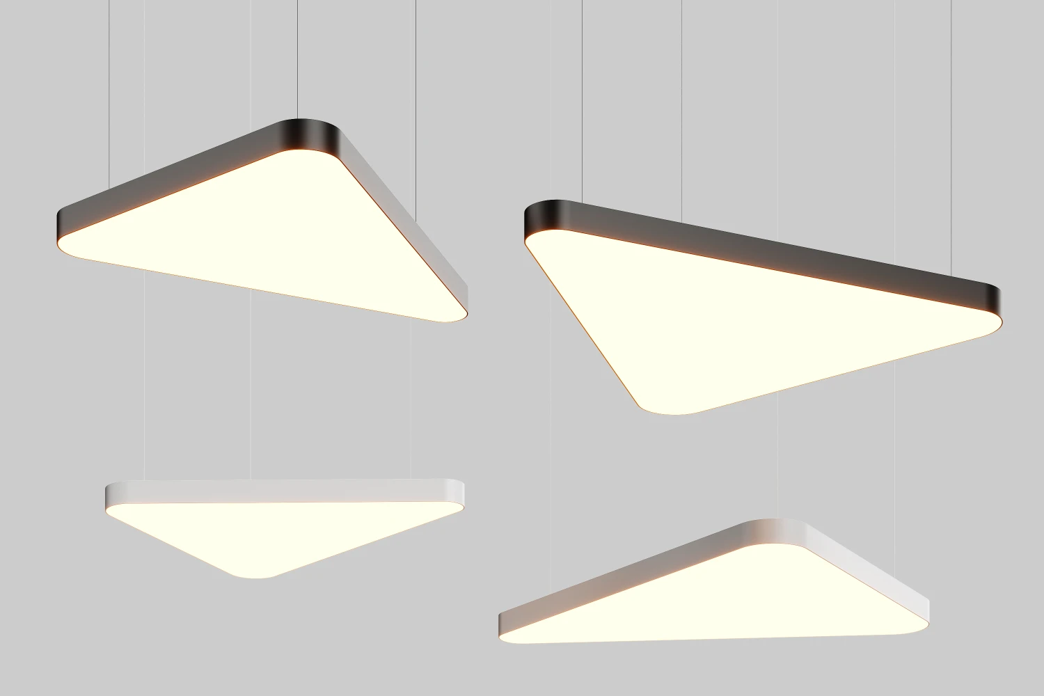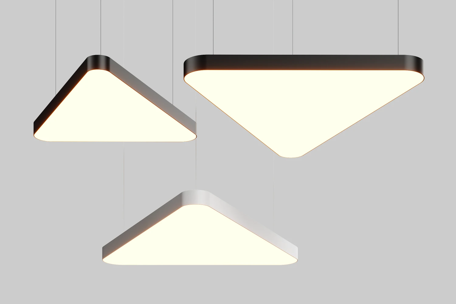 Светильник треугольной формы с полной засветкой, доступный в крупных размерах, подвесном и накладном исполнении, предназначен для освещения торговых залов, офисных помещений и декорирования зон. Его конструкция обеспечивает равномерное освещение, подходя для создания функциональных и эффективных решений в различных интерьерах. Многофункциональность монтажа позволяет адаптировать светильник под различные условия, обеспечивая гибкость в установке и эксплуатации.